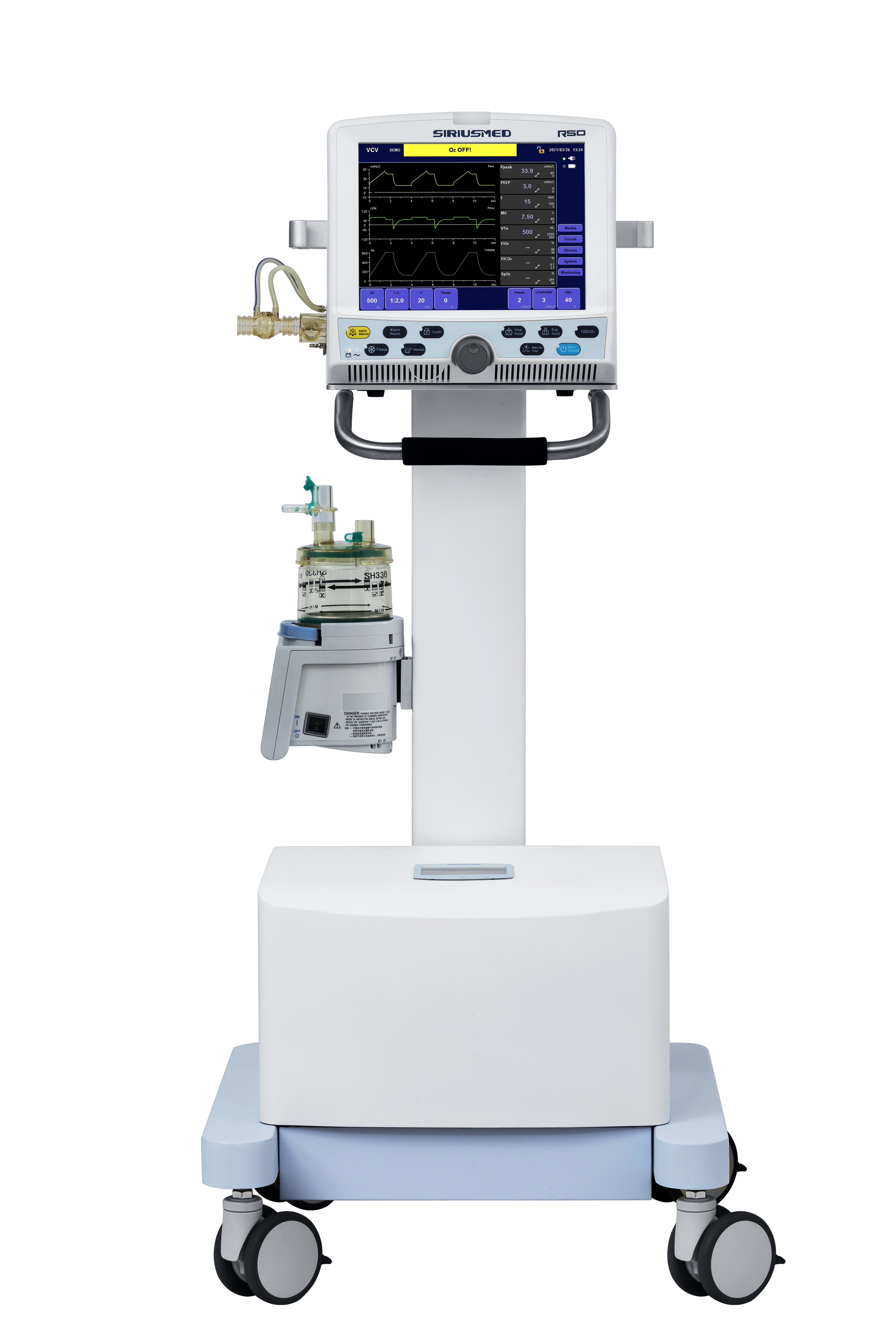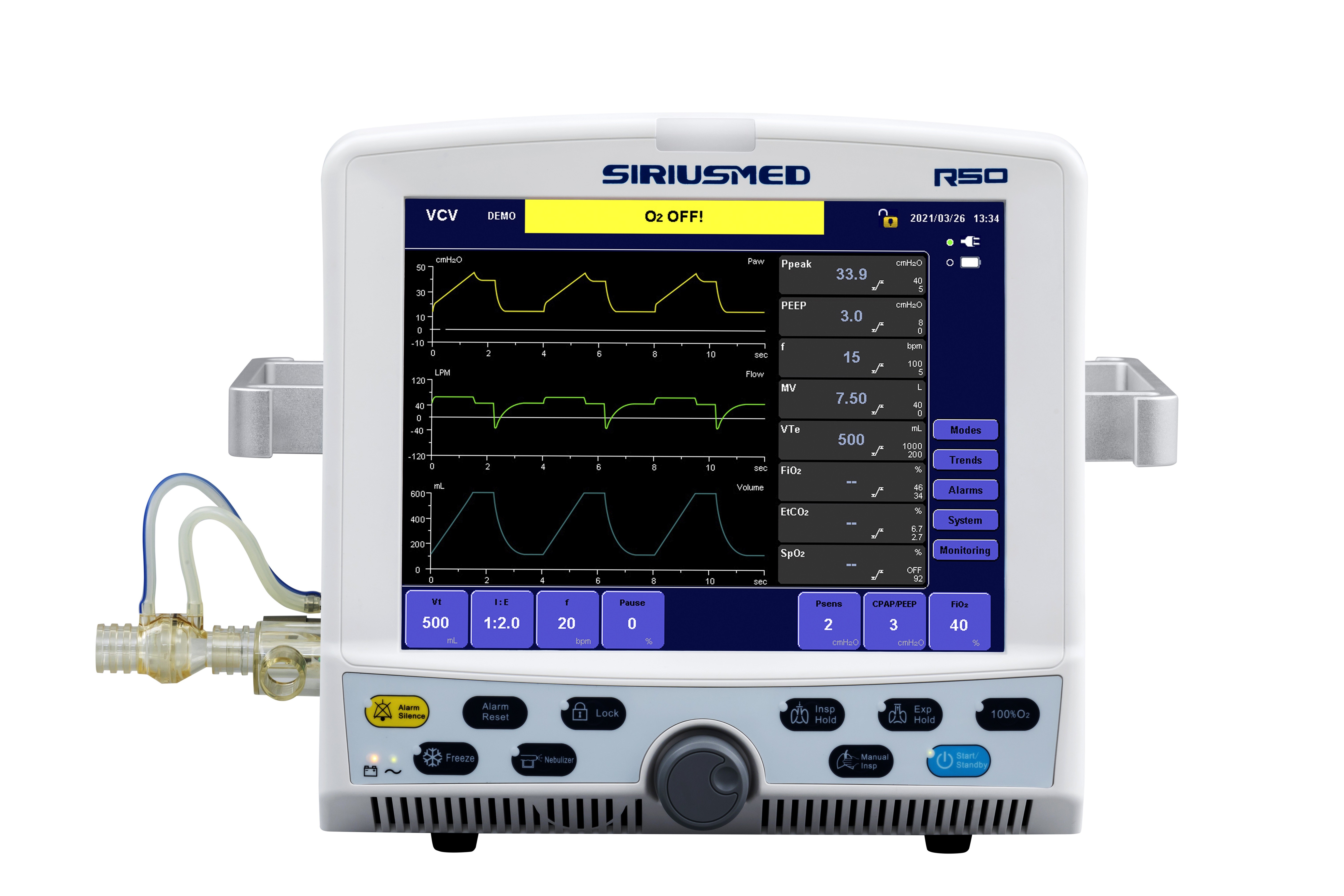 Uitademvolume Notulenvolume Zuurstofconcentratie Luchtroutedruk Ademhalingsfrequentie ETCO2 Polsslag Kringsocclusie Apneaalarm O2 LEVERING ONDERAAN ALARM Het alarm van de leidingenmislukking Het lage alarm van de batterijmacht Batterij gelost alarm Alarmstilte |